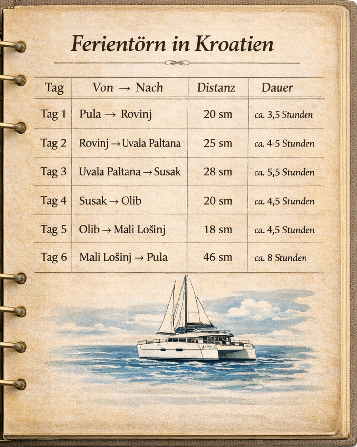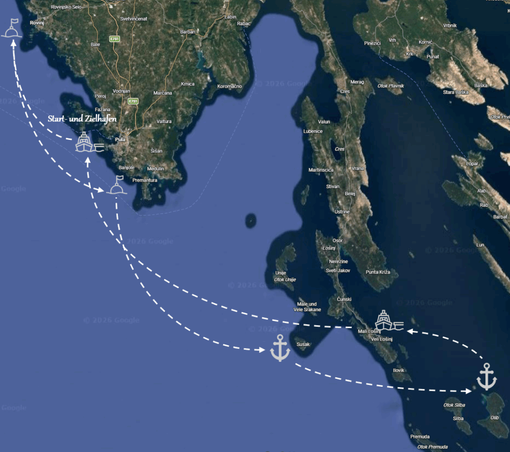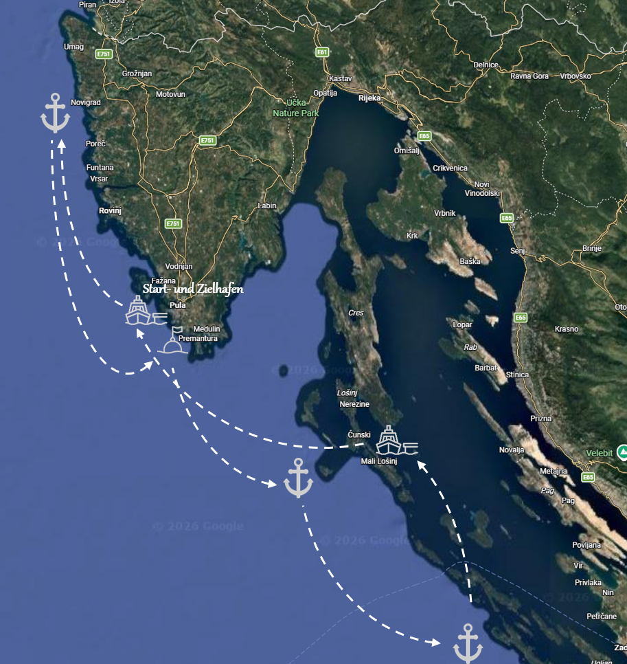 • Start und Ende ist jeweils in der Marina Polesana in Pula, Kroatien