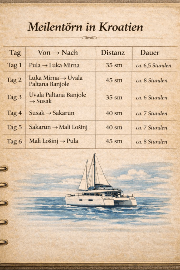 Auf der letzten Etappe segeln wir mit der LAZY BONE zurück nach Pula. Zeit für einen letzten Blick über das Meer, für Erinnerungen an eine Woche voller Eindrücke – und für einen ruhigen Abschluss im Hafen vor dem Check-out am Samstag morgen.